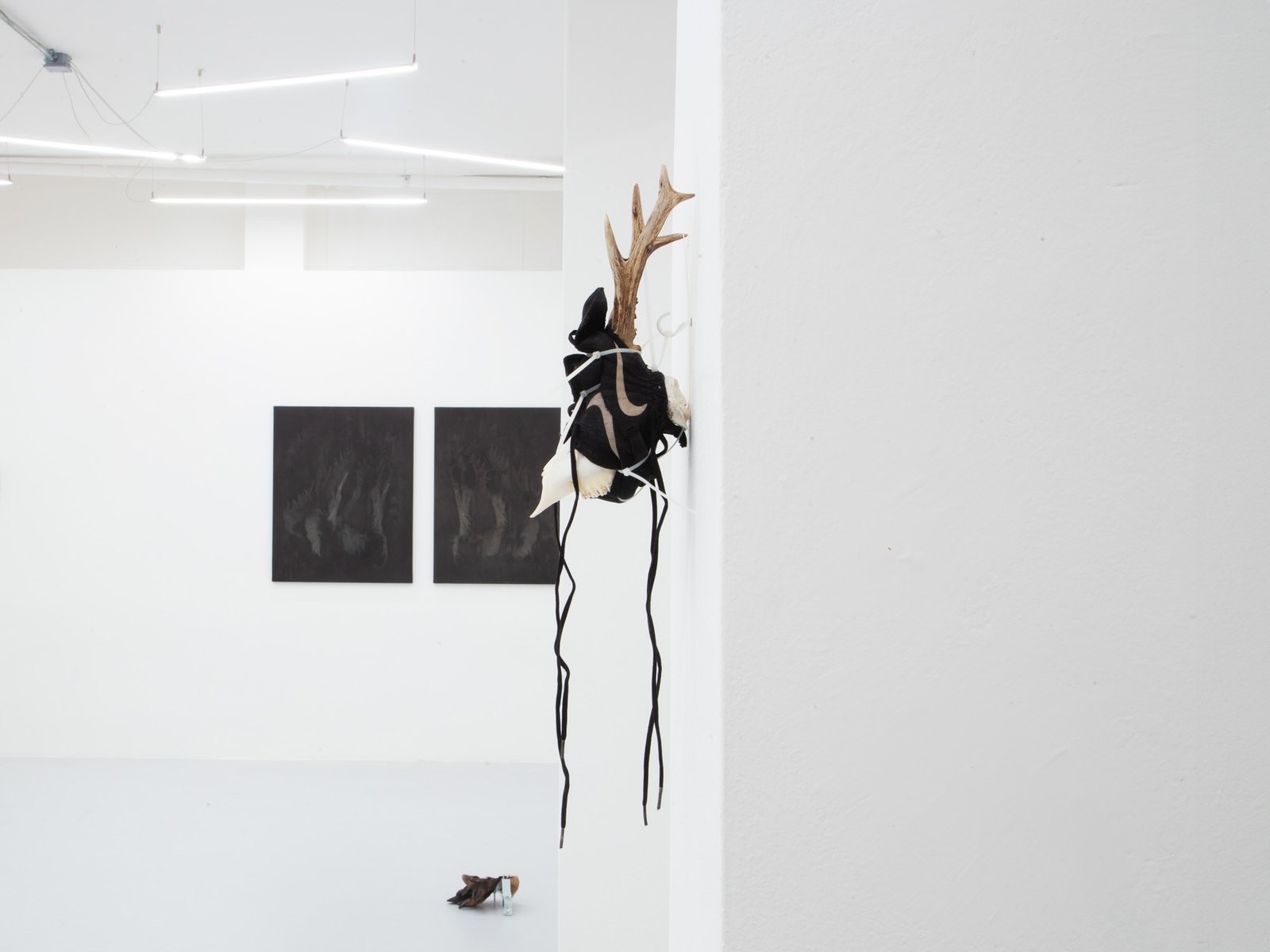 A Ballardian process in which the coexistence of material and imaginary elements gives rise to an archaeology of the present, through sculptures made by assembling discarded elements and bones found during excursions, a collection of blackened ceramic heads, casts of a silicone mask of Donald Trump used during the electoral campaign by his supporters, as well as through paintings that combine digitally printed images with a traditional painting behavior. This delineates a veritable environment in which each present element keeps on reworking the echo of the previous work.